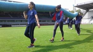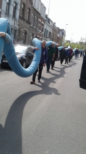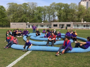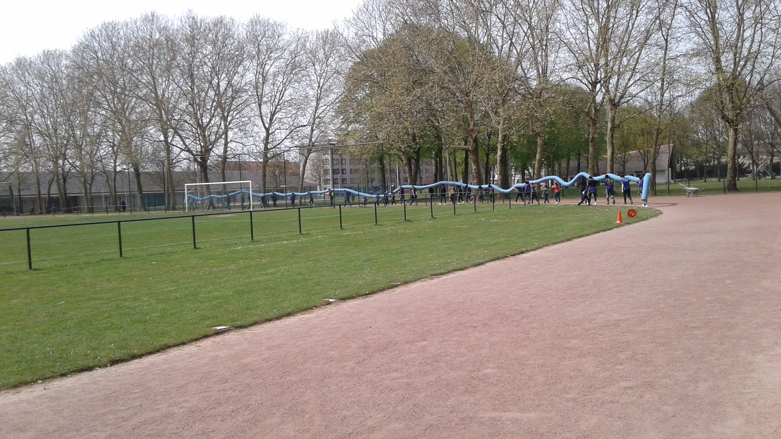 30 atleetjes zijn er in gelukt om het touw langs de Abdijstraat naar de atletiekpiste in het Kielpark te brengen
