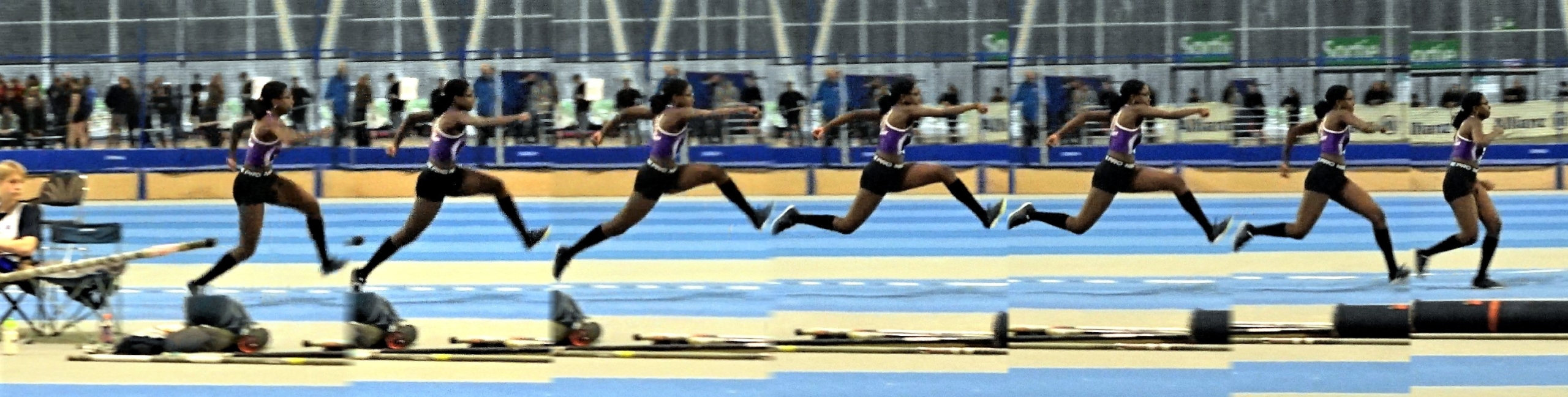 Eerste sprong echter slecht afgewerkte landing, en een tegenvallende 10m48. Oei, dat snapte ze zelf ook niet goed… Tweede sprong, uit evenwicht bij de landing van de stap, en doorgelopen. Daar het elektronisch scorebord regelmatig uitviel en we niet goed wisten welke positie ze stond, moest er een derde goede sprong komen. Echter bleef ze daar op een 10m26 hangen, maar bleek ze nog 8° te staan.