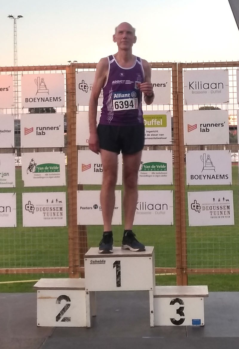 Daarna kwamen de mannen aan de start. Jef Geerts is nog niet zo lang aangesloten, maar maakt op korte tijd enorme progressie. Hij eindigde tweede bij de senios in een knappe tijd van 34:43. Bij de masters M55 bekroonde Bart Vanderschoot zich to provinciaal kampioen, proficiat Bart!