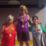 De vrouwen liepen deze keer apart en startten een uur vroeger. Jacy Janssen nam een snelle start en probeerde het eerste groepje te volgen, maar besloot dan wijselijk om haar eigen tempo te zoeken. Heel wat rondjes (25) om een 10km op de piste af te leggen en als je alleen loopt is dit een mentale uitdaging. Het ging goed, maar de laatste rondjes werden zwaar. Zwijmelend trok ze zichzelf over de finishlijn, overmand door de hitte, gedehydrateerd. Dat was toch even bekomen, maar haar trainer Massi nam de zorg op zich om met water wat verkoeling te brengen. Bovendien werd ze uitgepikt voor de dopingcontrole! Toch maar mooi gedaan en ze eindigde als tweede vrouw bij de senioren en ook provinciaal kampioen!