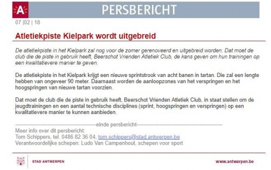 Onze piste op het Kielpark krijgt een sprintstrook van 90meter, 8 banen breed, in tartan. Ook de aanloopzones voor het ver- en hoogsprongen worden vernieuwd. Dit gaat Beerschot Atletiek in […...Read More
