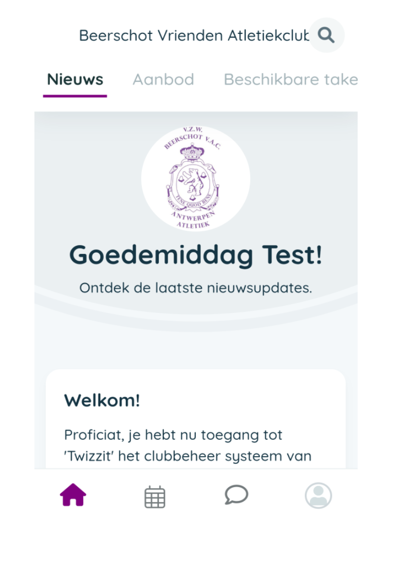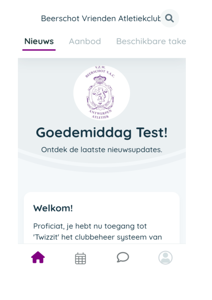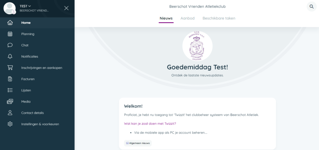 De Home pagina is de start pagina wanneer je Twizzit voor Beerschot Atletiek opent. Je vindt er een overzicht van het nieuws, het aanbod én de beschikbare taken.